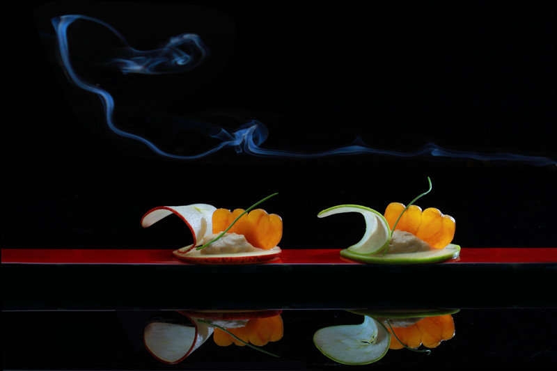 Πάστα αγκινάρας σε φέτα μήλου με φέτες αυγοτάραχο